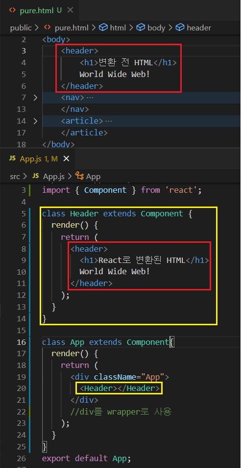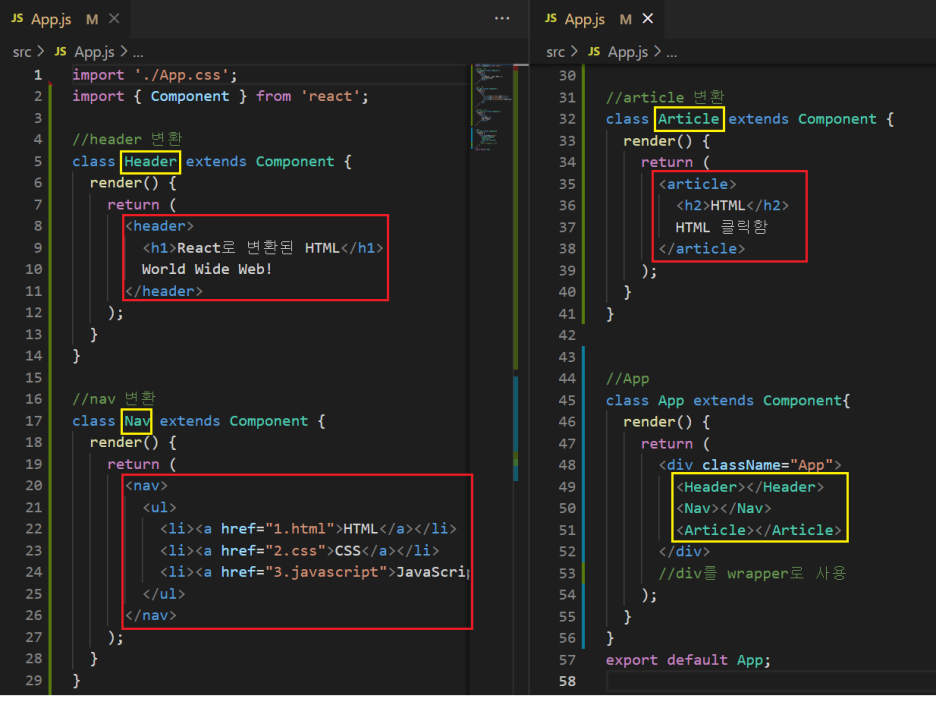 같은 방식으로 nav -> Header class, article -> Article class 로 변환하기!!
