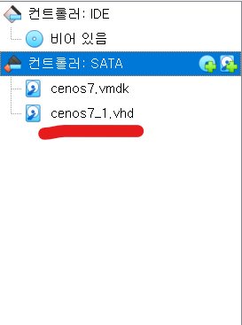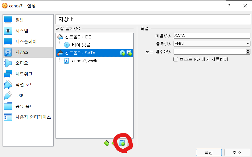 3. 저장소 -> 컨트롤러: SATA 선택 -> 하단 아이콘의 선택 -> 하드디스크 선택