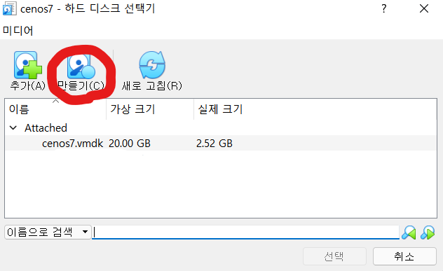 4. 만들기 선택 -> 본인 용도 맞게 하드디스크 종류 선택 -> 동적할당 -> 용도 맞게 크기 선택 -> 디스크 생성 됨!